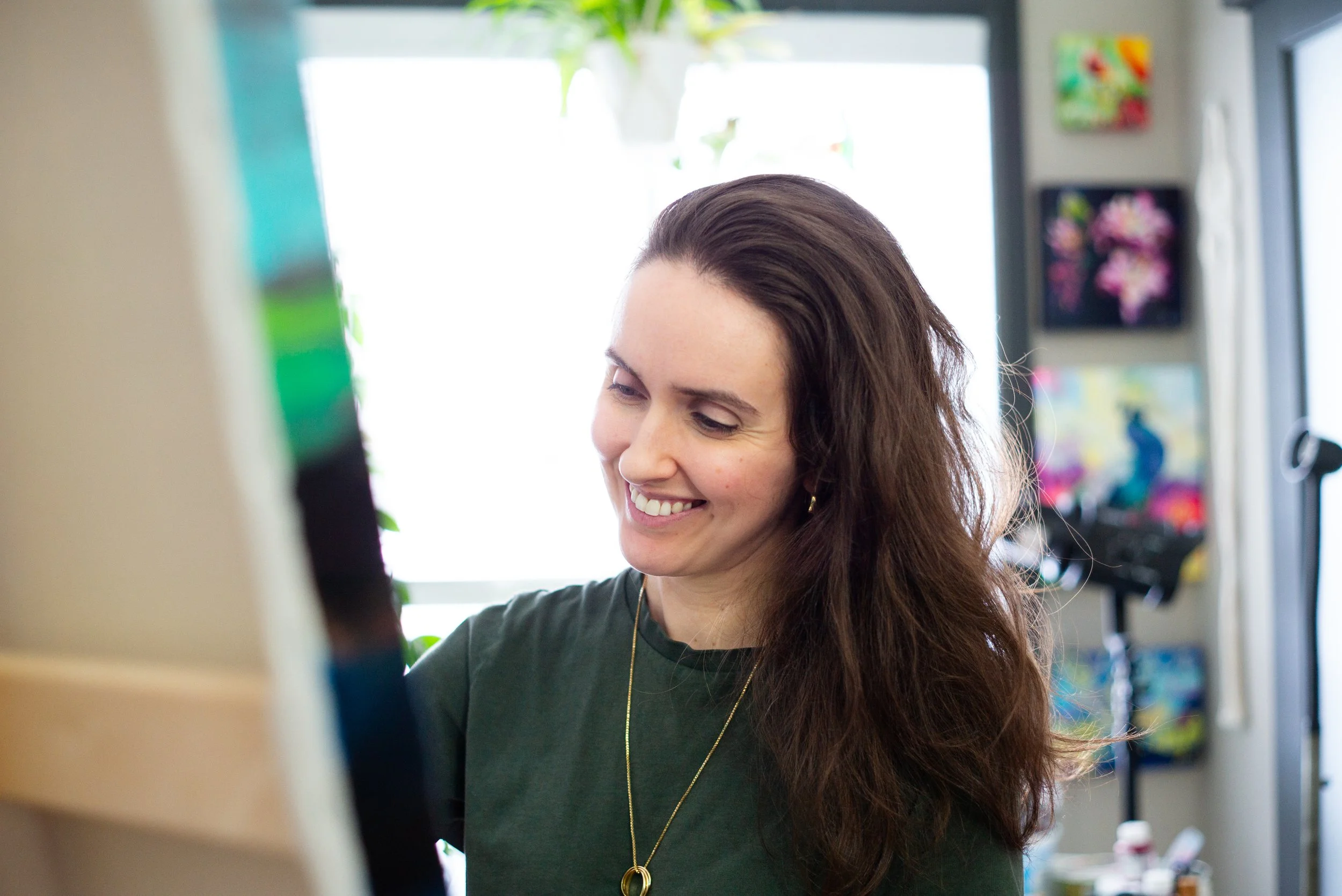 Je réside à Lévis avec mon mari et nos deux enfants. Voir ces derniers s’émerveiller devant toutes les belles choses que la vie met sur notre passage m’inspire à vouloir peindre le beau et le doux autour de nous et en nous.